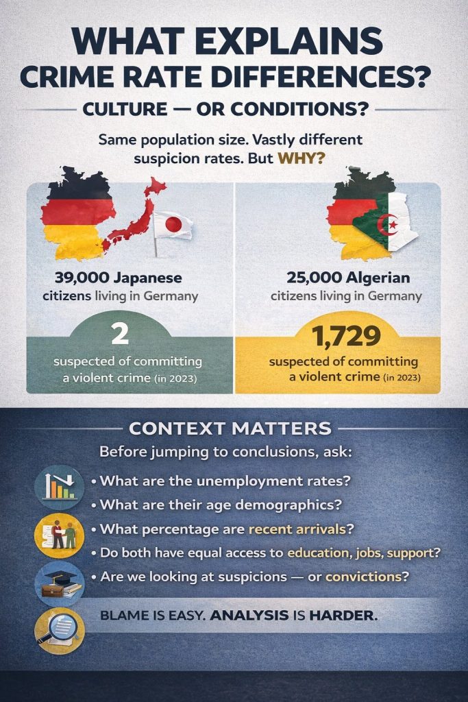 وتظهر البيانات كذلك أن نسب الاشتباه تختلف بشكل واضح بين الجنسيات الأوروبية وبعض الجنسيات القادمة من مناطق تشهد توترات سياسية أو أوضاعا اقتصادية صعبة، ما يفتح نقاشا أوسع حول سياسات الهجرة، والاندماج، والعدالة الاجتماعية.