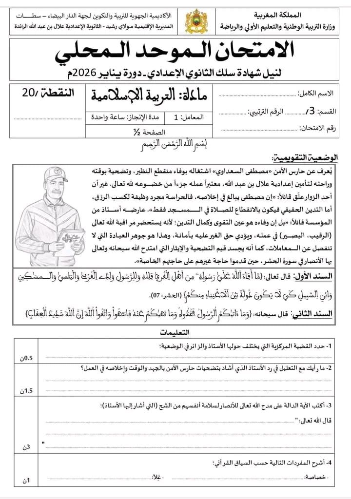 أساتذة يكرمون حارس أمن بجعله قدوة تربوية في اختبار التربية الإسلامية.. (وثيقة)