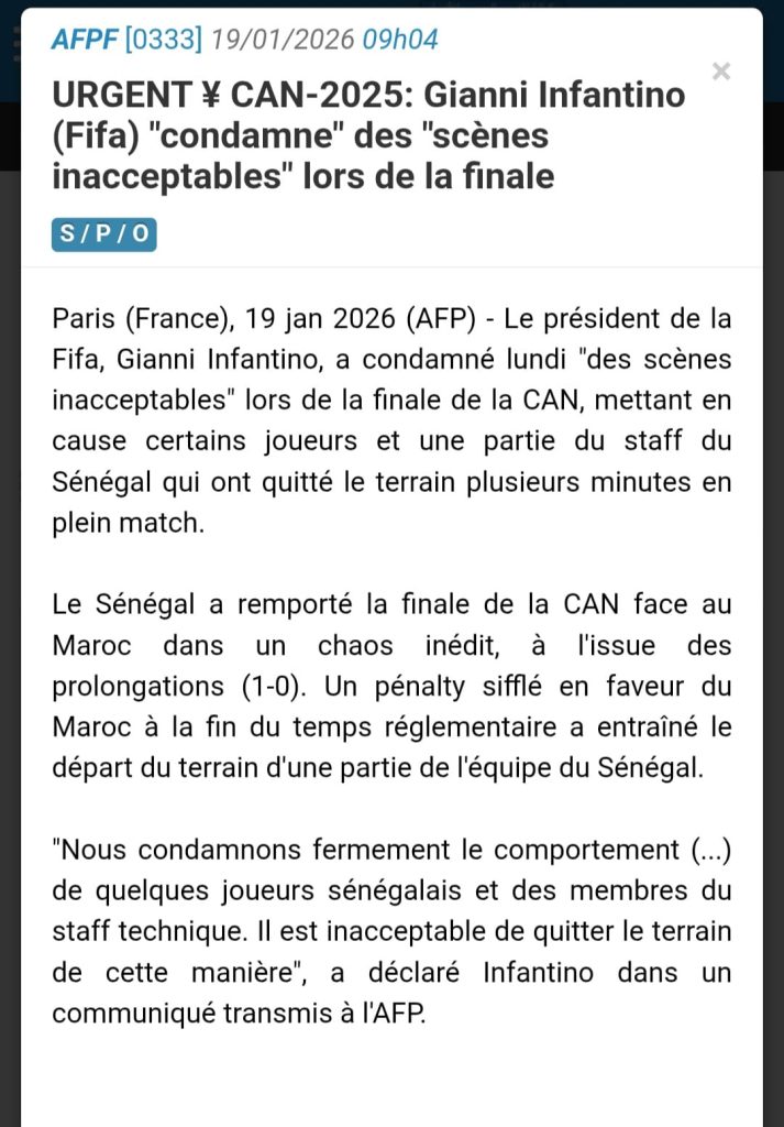 أدان رئيس الاتحاد الدولي لكرة القدم (فيفا)، جياني إنفانتينو، ما وصفه بـ”المشاهد غير المقبولة” التي شهدتها المباراة النهائية لكأس الأمم الإفريقية 2025، والتي جمعت بين المنتخبين المغربي والسنغالي، مساء الأحد، بالعاصمة الرباط.