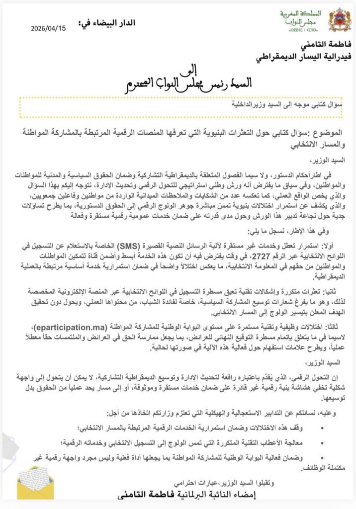 وأوضحت النائبة البرلمانية فاطمة التامني، أن هذه الأعطاب تطرح تساؤلات جدية بشأن فعالية التحول الرقمي في دعم الديمقراطية التشاركية، خاصة في ظل شكاوى ميدانية متزايدة من مواطنين وفاعلين جمعويين حول صعوبات الولوج إلى الخدمات الرقمية المرتبطة بالعملية الانتخابية.