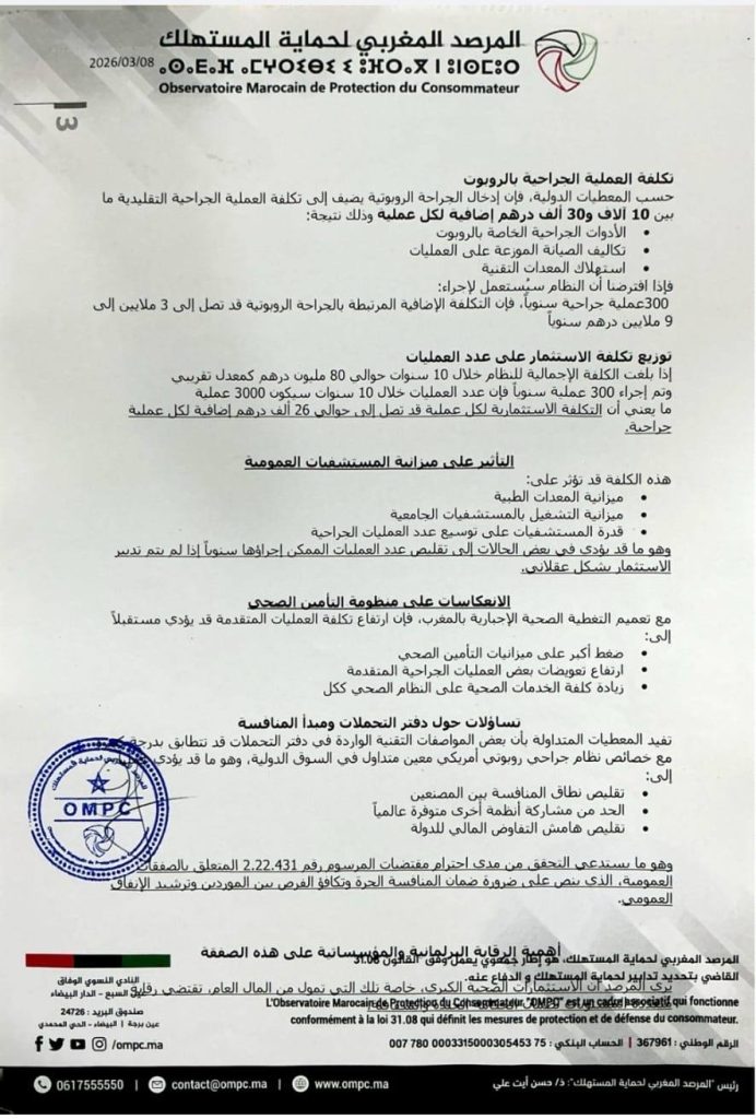 وفي مذكرة تحليلية صادرة عن المرصد المغربي لحماية المستهلك، دعا المرصد إلى ضرورة ضمان المنافسة العادلة والشفافية في تدبير هذه الصفقة، مؤكدا أن إدخال الجراحة الروبوتية يمثل خطوة مهمة في تحديث المنظومة الصحية الوطنية، لكنه يقتضي في المقابل تدبيرا دقيقا للمال العام واحتراما صارما لمبادئ الصفقات العمومية.