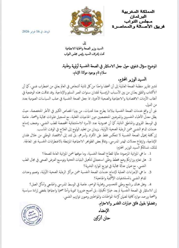 وفي هذا السياق، طالب السؤال البرلماني الوزارة الوصية بتوضيح الميزانية المخصصة حاليا لقطاع الصحة النفسية وموقعها ضمن الميزانية العامة للصحة، إضافة إلى الكشف عن خطط تأهيل البنيات التحتية وتوسيع العرض الصحي وتحقيق عدالة مجالية في توزيع الموارد البشرية المتخصصة.