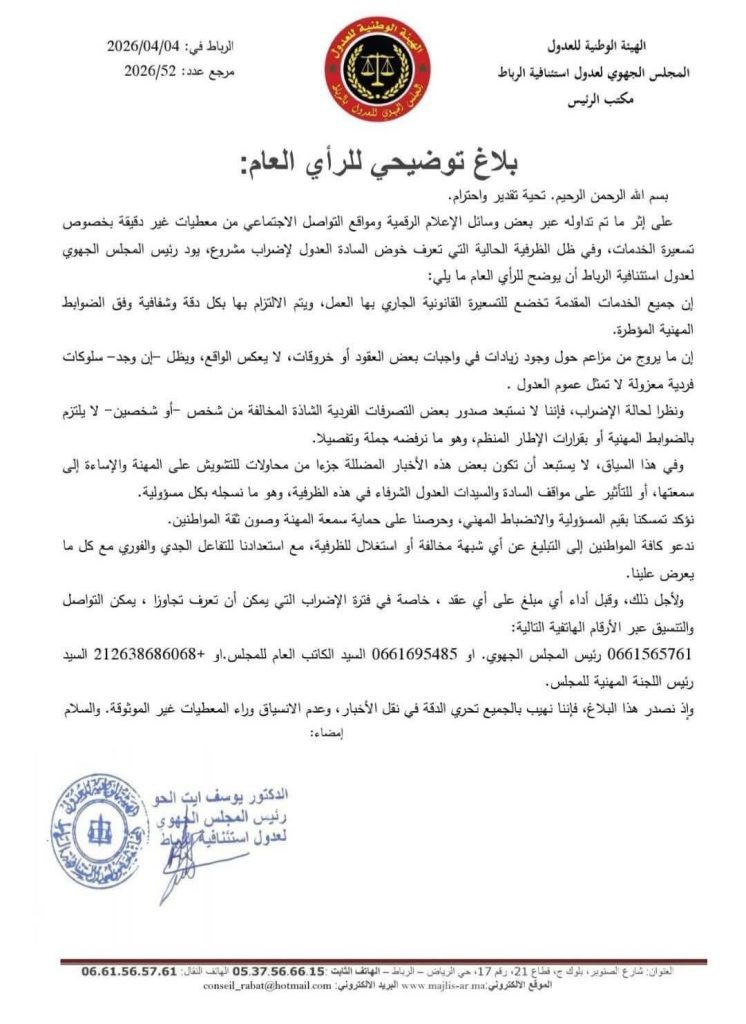 ودعت الهيئة كافة المواطنين إلى التبليغ الفوري عن أي شبهة مخالفة أو استغلال للظرفية الحالية، معلنة عن وضع أرقام هاتفية مباشرة للتواصل مع رئيس المجلس، والكاتب العام، ورئيس اللجنة المهنية، لضمان التنسيق والتأكد من المبالغ المؤداة قبل توثيق أي عقد، وذلك لقطع الطريق أمام أي تجاوزات محتملة خلال فترة الإضراب.