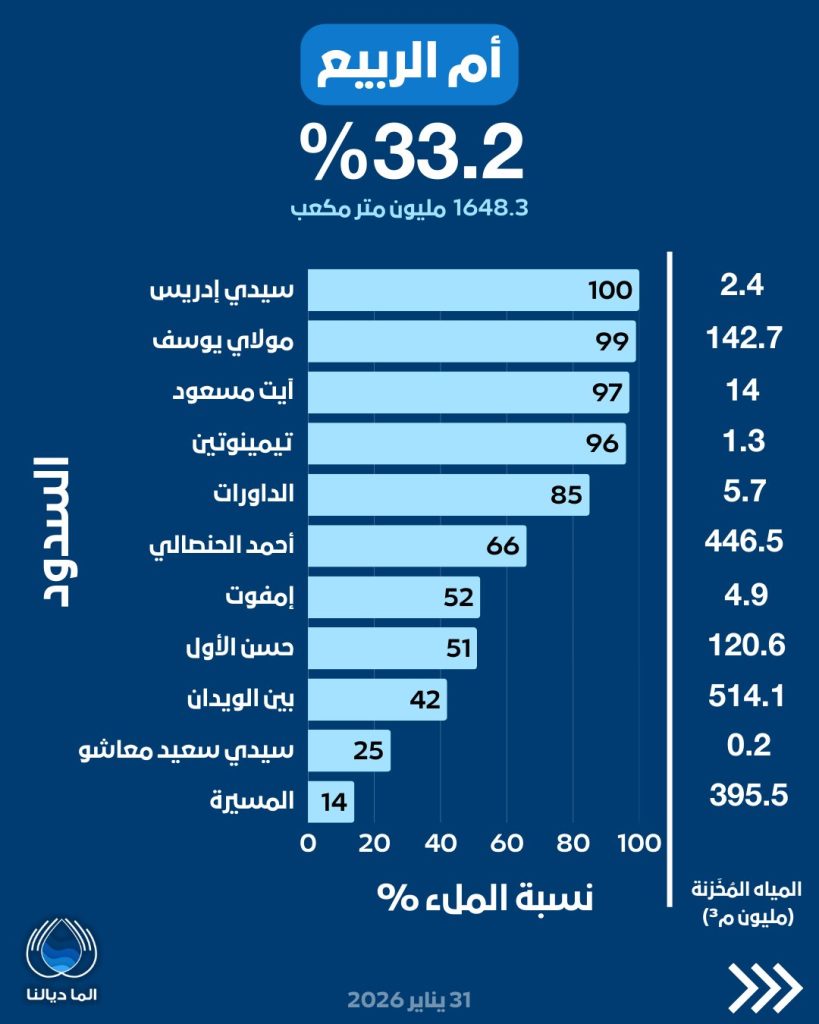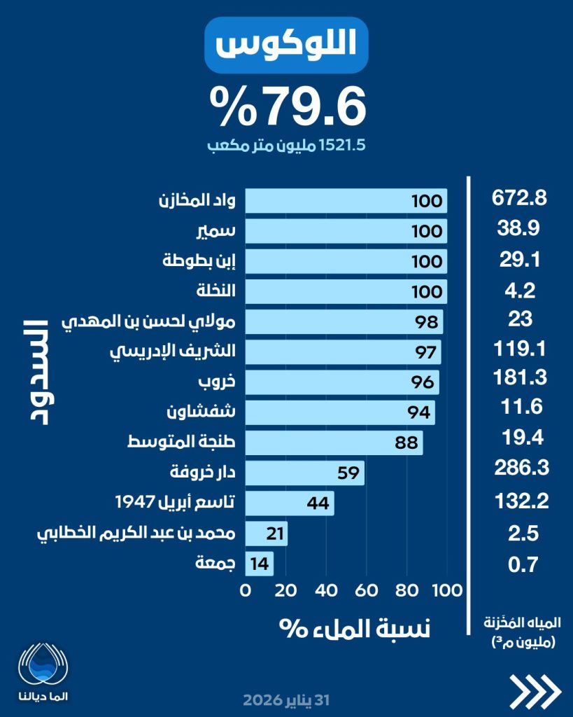 ويعد هذا المستوى من التخزين المائي من بين الأعلى المسجلة خلال السنوات الأخيرة، في سياق وطني اتسم بندرة المياه وتراجع الفرشة المائية، ما يمنح هامش أمان نسبيا لتلبية حاجيات الماء الشروب، والسقي الفلاحي، والأنشطة الاقتصادية الحيوية خلال الأشهر المقبلة.