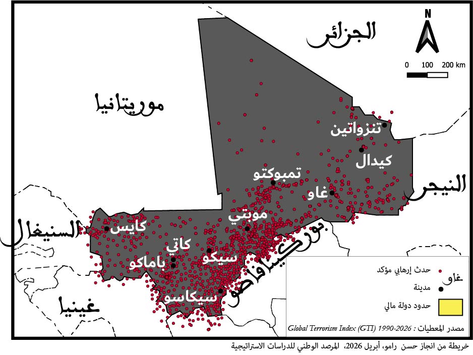 شهدت مالي في 25 أبريل 2026، سلسلة من الهجمات الإرهابية المنسّقة، استهدفت عدداً من المدن والمواقع الاستراتيجية، من بينها باماكو، وكاتي (القاعدة العسكرية)، وموبتي، وغاو، وكيدال بالشمال، وسيكاسو وسيفاري. وقد تبنّت هذه العمليات جماعة نصرة الإسلام والمسلمين المرتبطة بتنظيم القاعدة، وذلك بالتنسيق مع جبهة تحرير أزواد. وحتى لحظة كتابة هذه السطور، لم تقدّم السلطات المالية حصيلة دقيقة ومفصلة لهذه الهجمات، رغم إعلانها عن مقتل وزير الدفاع ساديو كامارا، وتحييد أكثر من 200 عنصر إرهابي، إضافة إلى سقوط عدد غير محدد من المدنيين والعسكريين. في المقابل، ترجّح بعض التقارير الإعلامية أن يتجاوز عدد الضحايا ألف قتيل، وهذا ما يعكس حجم الضبابية التي لا تزال تكتنف المشهد الأمني.