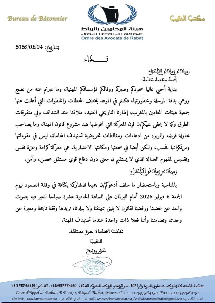 أصدرت هيئة المحامين بالرباط بلاغًا مهنيًا موجّهًا إلى المحاميات والمحامين، دعت من خلاله إلى التعبئة الشاملة والمشاركة المكثفة في وقفة احتجاجية مرتقبة أمام مبنى البرلمان بالعاصمة الرباط، يوم الجمعة 6 فبراير 2026 على الساعة الحادية عشرة صباحًا، وذلك في سياق تصاعد التوتر المهني المرتبط بمشروع قانون المهنة، وما يثيره من جدل واسع داخل الأوساط القانونية حول انعكاساته المحتملة على استقلالية الدفاع ومكانة المحامي داخل منظومة العدالة.