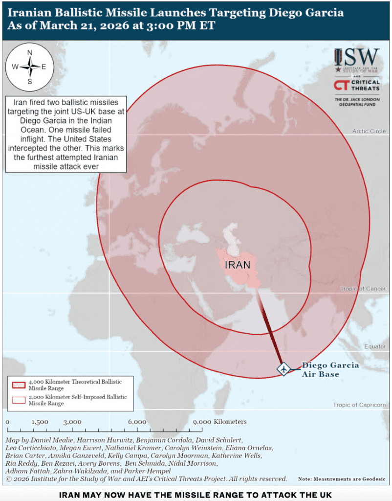 وقد أثارت المخاوف بعد أن أطلقت إيران صاروخين على قاعدة بريطانية أمريكية في جزيرة دييغو غارسيا بالمحيط الهندي، في مدى يقترب من 2500 ميل، ما يشير إلى أن طهران قد تمتلك القدرة على الوصول إلى الأراضي البريطانية بصواريخها، وإن كانت حمولتها ستقتصر على تأثير محدود، وفق خبراء عسكريين.