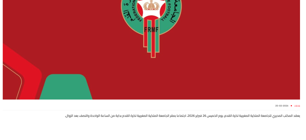 تتجه أنظار الشارع الرياضي المغربي، يومه (الخميس) 26 فبراير 2026، إلى مقر الجامعة الملكية المغربية لكرة القدم، حيث يعقد المكتب المديري اجتماعا انطلاقا من الساعة الواحدة والنصف بعد الزوال، في سياق يطغى عليه ترقب واسع بشأن مستقبل القيادة التقنية لأسود الأطلس.