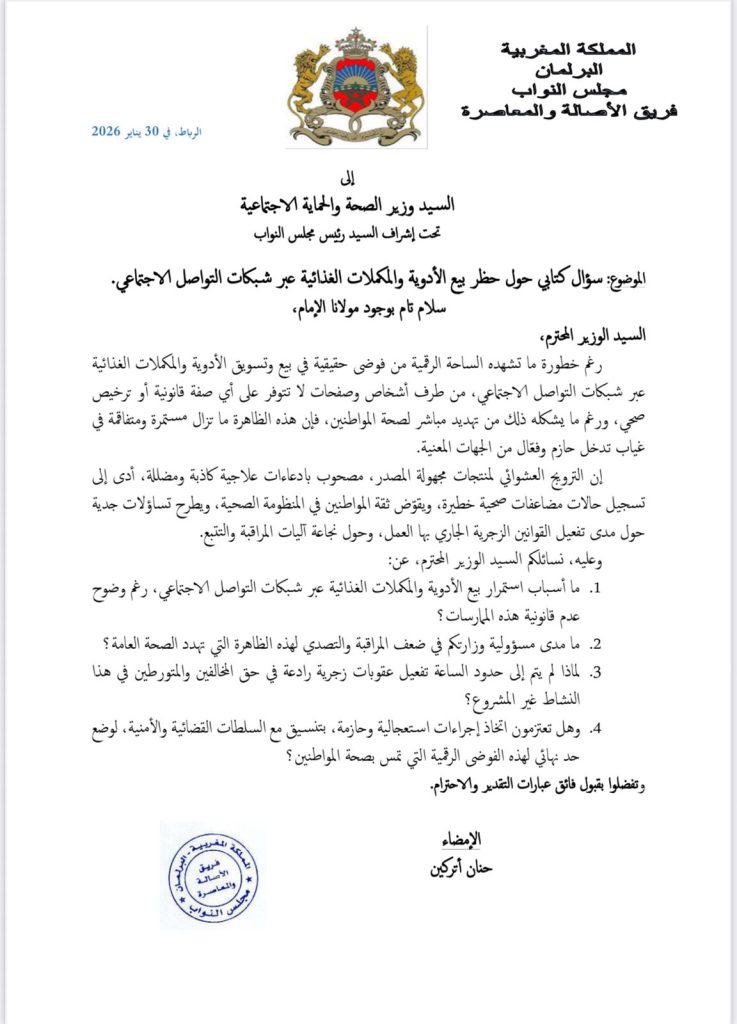 وجهت النائبة البرلمانية حنان أتركين، عن فريق الأصالة والمعاصرة، سؤالا كتابيا إلى وزير الصحة والحماية الاجتماعية، دقت فيه ناقوس الخطر بشأن تنامي ظاهرة بيع الأدوية والمكملات الغذائية عبر منصات التواصل الاجتماعي خارج أي إطار قانوني أو رقابي.