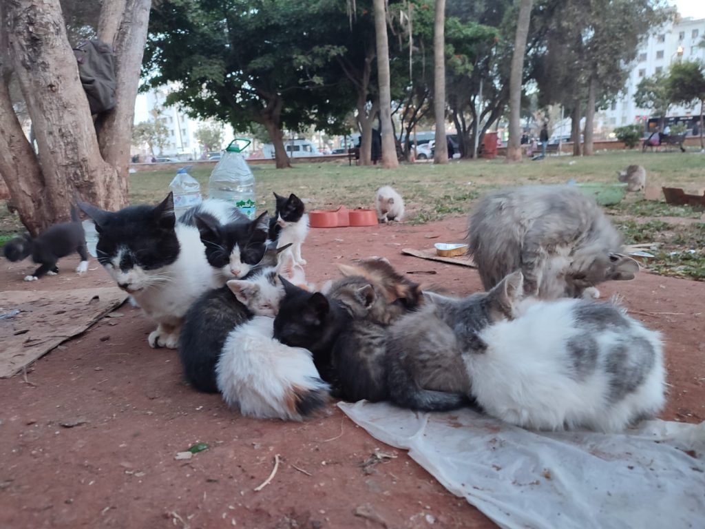 في زوايا الحديقة الصغيرة القريبة من سوق ما كان بعرف بـ“البحيرة” بالمدينة القديمة في الدار البيضاء، تتجمع عشرات القطط الهزيلة حول أوعية بلاستيكية وصناديق الكرتون المملوءة بالماء والحليب.
