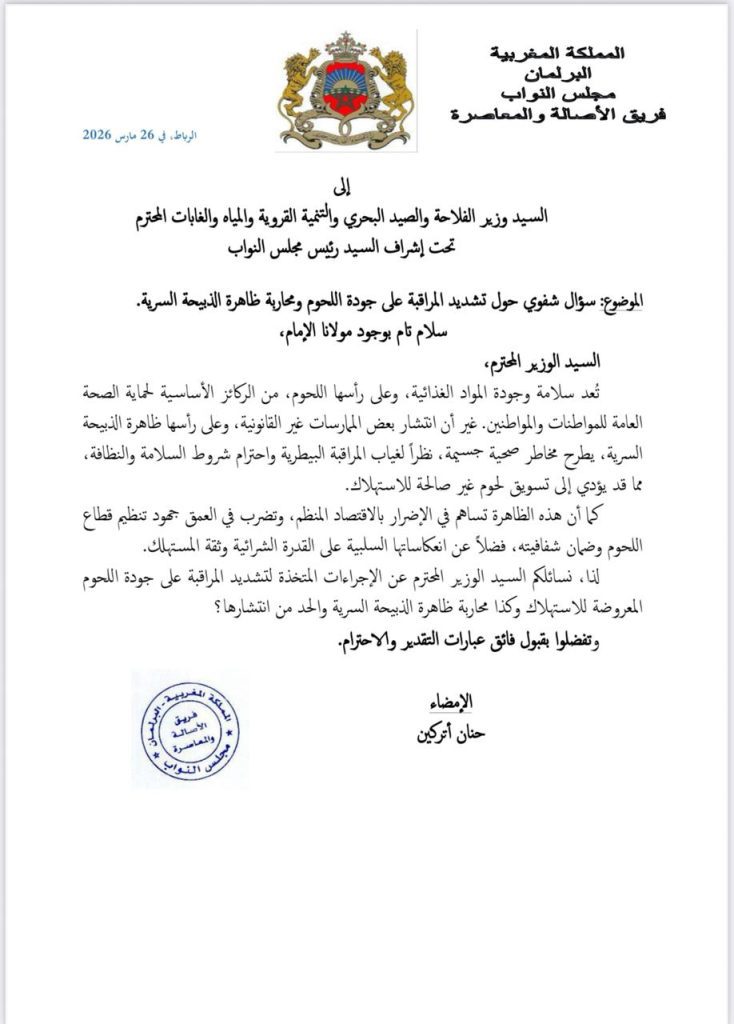 وجاء في مضمون السؤال، المؤرخ بتاريخ 26 مارس 2026، أن سلامة وجودة المواد الغذائية، وعلى رأسها اللحوم، تمثل ركيزة أساسية في حماية الصحة العامة للمواطنين، في ظل تزايد بعض الممارسات غير القانونية التي تهدد هذا التوازن، خاصة ما يتعلق بالذبيحة السرية.