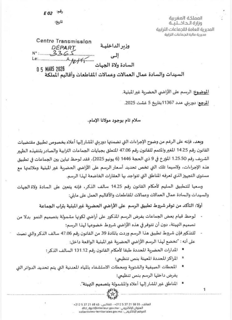 وشددت الدورية التي اطلعت عليها جريدة “الشعاع”، على ضرورة التأكد من توفر شروط فرض هذا الرسم، منبهة إلى أن بعض الجماعات تفرضه على أراضٍ مشمولة بـ “تصميم النمو” بدلاً من “تصميم التهيئة”، وهو ما يعد مخالفة للمقتضيات القانونية التي تحصر الوعاء الضريبي في المناطق المحددة بنصوص تنظيمية أو مشمولة بتصميم التهيئة.