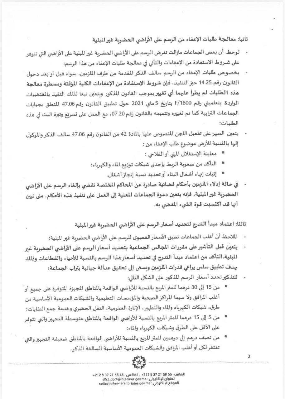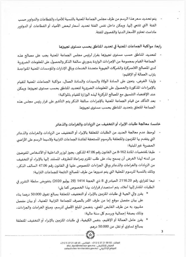 وأما المناطق متوسطة التجهيز التي تتوفر على الطرق وشبكات الكهرباء والماء، فقد حصرت الدورية سعر الرسم فيها بين 5 و15 درهما، بينما تكتفي المناطق ضعيفة التجهيز بفرض رسم يتراوح بين نصف درهم ودرهمين فقط للمتر المربع.