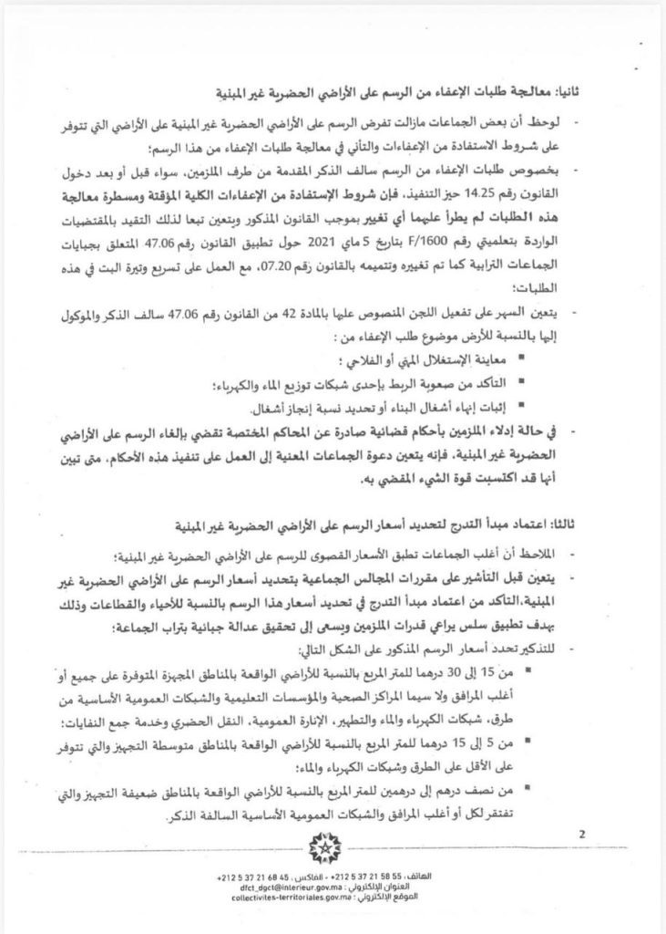 وتضمنت أيضا تعليمات صارمة لتسريع البت في طلبات الإعفاء، خاصة للأراضي المخصصة للاستغلال المهني أو الفلاحي، أو تلك التي يواجه أصحابها صعوبات في الربط بالشبكات العامة أو لم تكتمل فيها أشغال البناء بنسب محددة.