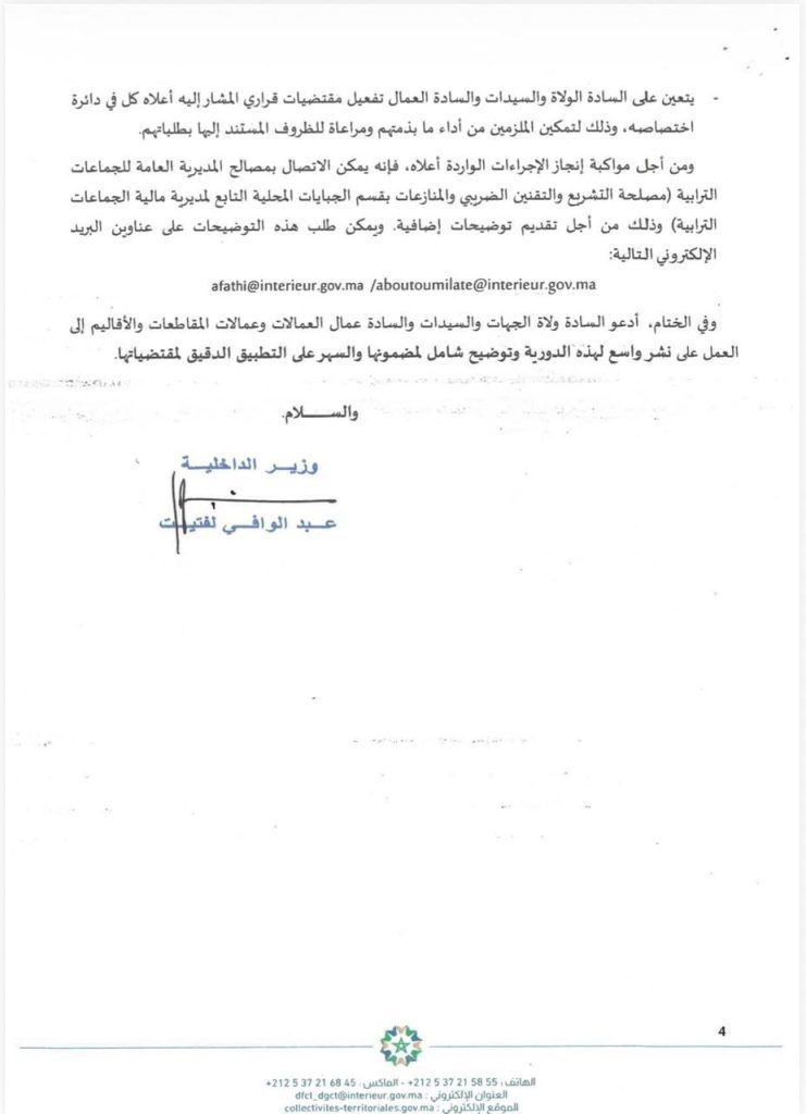 ودعا الوزير لفتيت المصالح المركزية بالمديرية العامة للجماعات الترابية لمواكبة الجماعات في إنجاز هذه الإجراءات، مع توفير قنوات اتصال بريدية مباشرة للإجابة على التساؤلات وضمان التطبيق الدقيق لهذه التوجيهات.