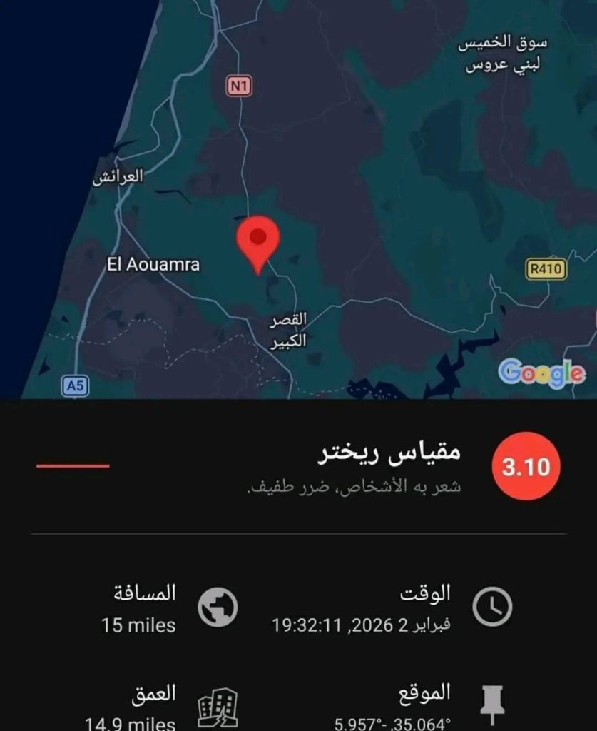 سجلت مساء يومه (الاثنين)، ضواحي مدينة القصر الكبير التابعة لإقليم العرائش، هزة أرضية خفيفة بلغت شدتها 3.10 درجات على مقياس ريختر.