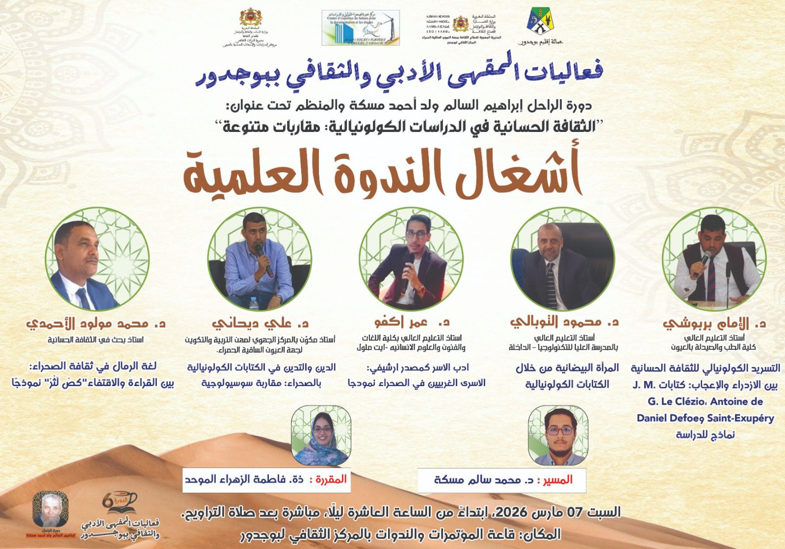 ينظم مركز خبرة الصحراء للتوثيق والدراسات، بشراكة مع المديرية الجهوية لقطاع الثقافة بجهة العيون الساقية الحمراء، وبالتعاون مع مركز الدراسات